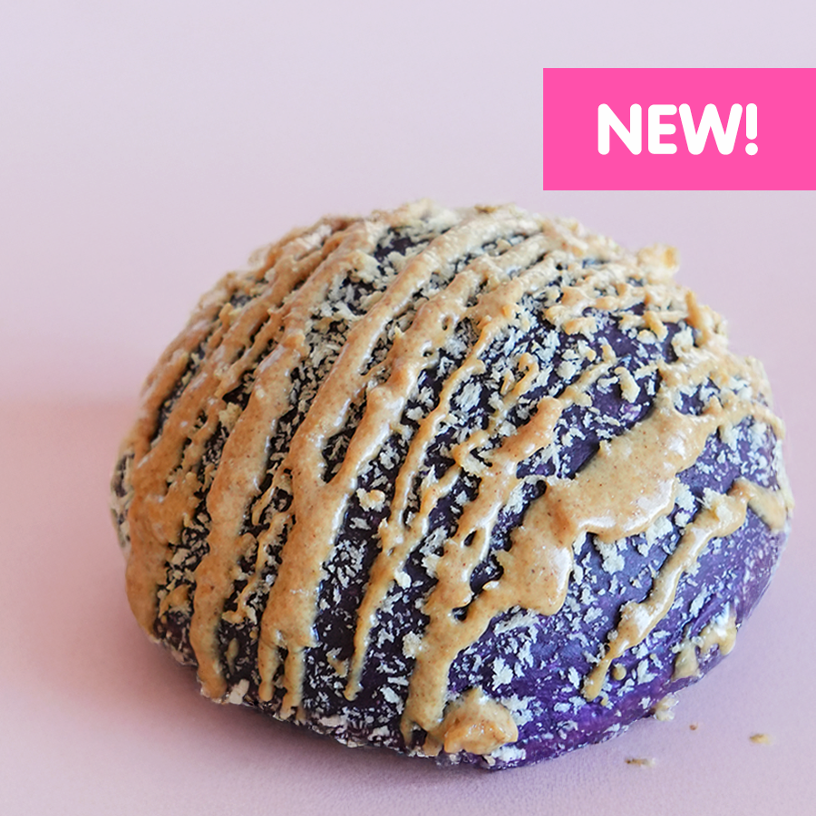 Soft, fluffy ube bun filled with Oob® (our scratch-made ube jam) and a layer of crunchy peanut butter, rolled in crunchies, and then finished with a peanut butter glaze. Not exactly a protein bun but it does have more protein than other Bad Oven buns! 😅
